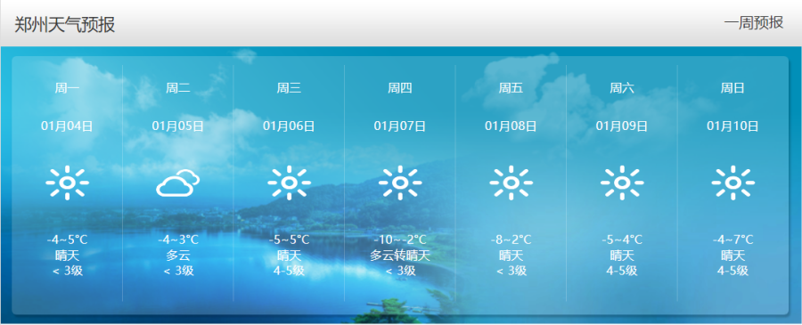 郑州3日夜里到4日,多云到晴天,有轻到中度霾;4日,晴天转多云。东北风2到3级明天下午加大到3到4级。最低温度:零下4度到零下3度;最高温度:5到6度。
