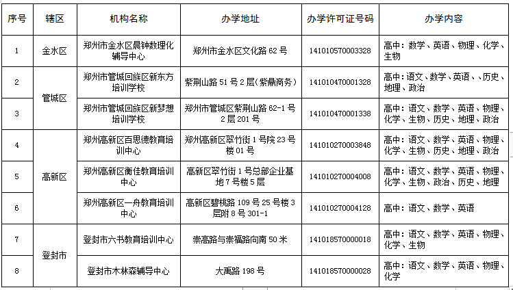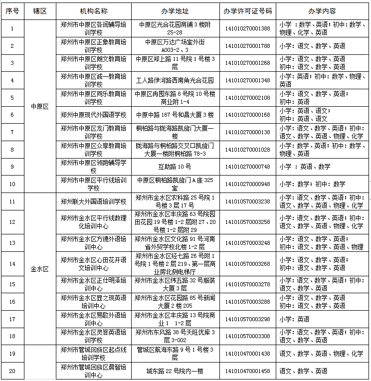 2月15日,“郑州市学科类违规培训‘随手拍’投诉举报平台”正式上线启用。郑州市教育局再次提醒市民朋友审慎选择学科类校外培训机构,现将学科类校外培训机构白名单及各开发区、区县(市)学科类校外培训机构监督举报电话公布如下,请广大市民朋友给予监督。