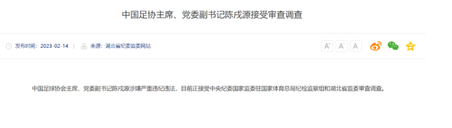 2月14日,中纪委国家监委驻国体局纪检监察组官宣,中国足协主席、党委副书记陈戌源涉嫌严重违纪违法,目前正接受中纪委监察组和湖北省监委审查调查。