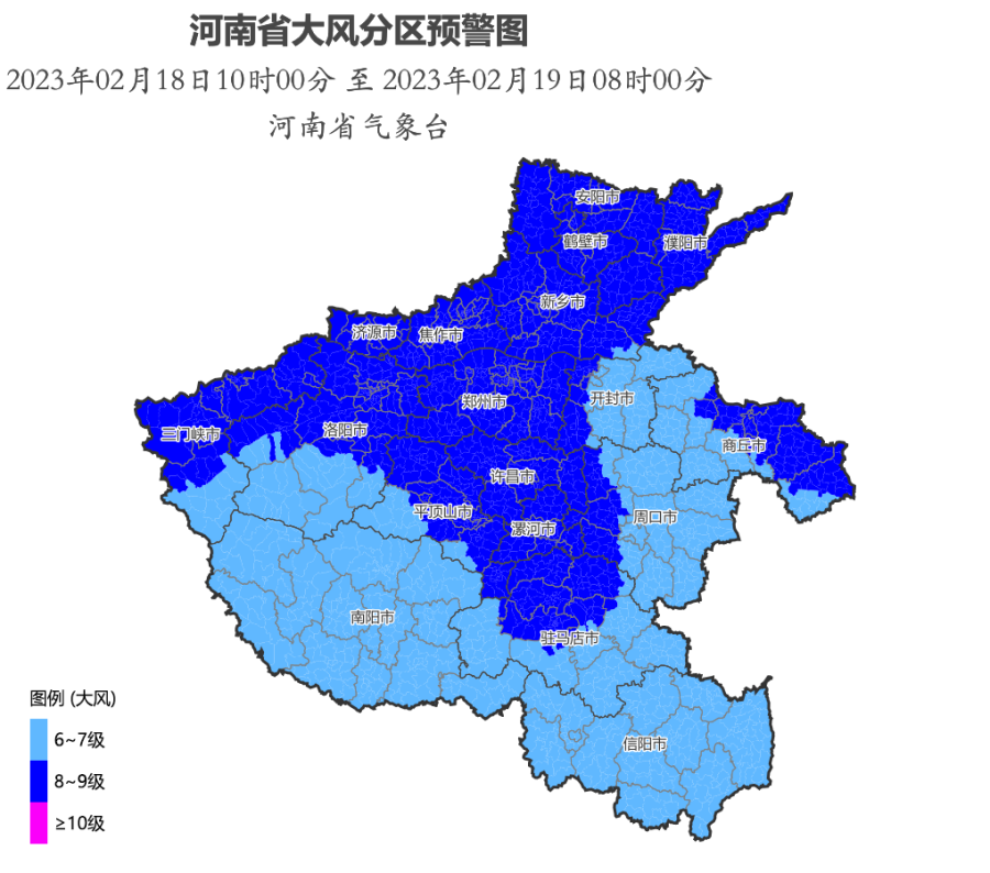 河南省气象台2023年2月18日10时发布大风蓝色预警:预计今天白天到夜里,全省大部西北风或偏北风4到5级,阵风6到7级,其中黄河以北和三门峡、洛阳、郑州、许昌、平顶山、漯河、驻马店西部、周口西部、开封西部、商丘中东部阵风8到9级。请注意防范。