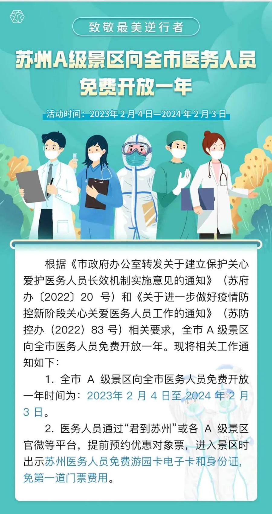 为关心爱护医务工作者,自2023年2月4日至2024年2月3日,苏州A级景区向全市医务人员免费开放一年。