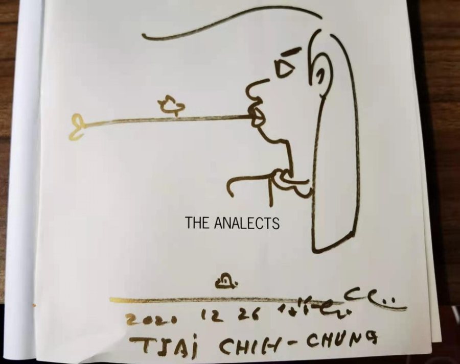 疫情以来,他没出过门,第一次参加活动就是来上海,戴标志性的礼帽,穿着惯常的白衬衫、卡其裤,出现在上海外文书店的蔡志忠,携四册普林斯顿“图说中国经典系列”漫画新作《论语》《庄子》《孙子兵法》《道德经》。在签售时,按惯例,他会给读者送上一幅漫画,常常是蔡志忠本人的自画像:长发、口中衔着一根稻草,草上站着一只鸟。“他们说画烟不允许,后来我就改成了稻草。”