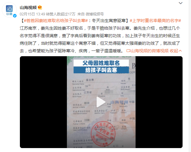 #爸爸因姜姓难取名给孩子叫去寒#