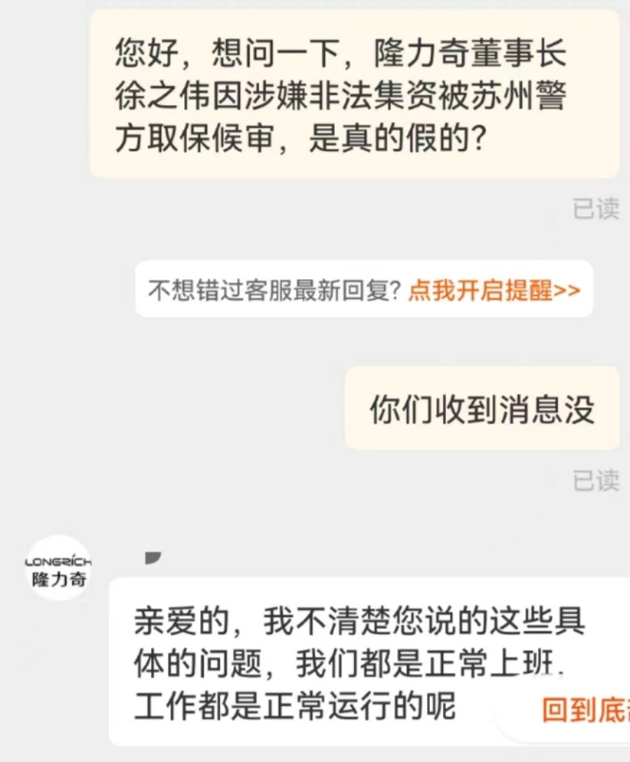 2月21日下午,正观新闻记者联系隆力奇公司工作人员,对方表示,目前公司运营正常,对董事长被取保候审,回复“不太清楚是什么情况”,在记者进一步询问后,要求“采访稿件发至邮箱,到时候帮您反馈公司”。截至发稿前,隆力奇未做出回应。