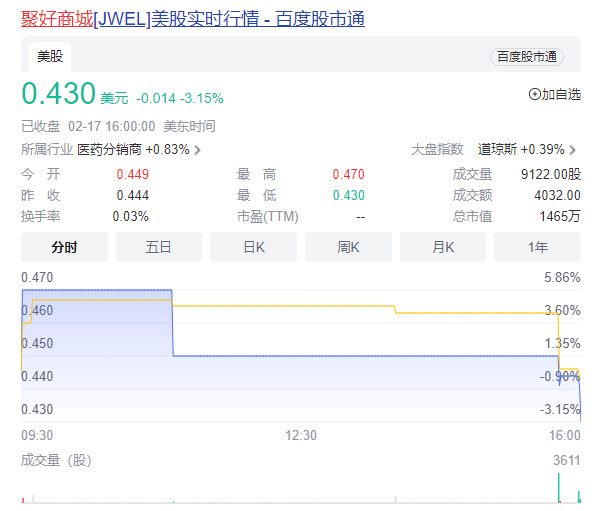 记者发现,截至2月17日(美国东部时间)收盘,聚好商城(JWEL.US)报收于0.43美元/股,跌幅3.15%,总市值1465万美元。
