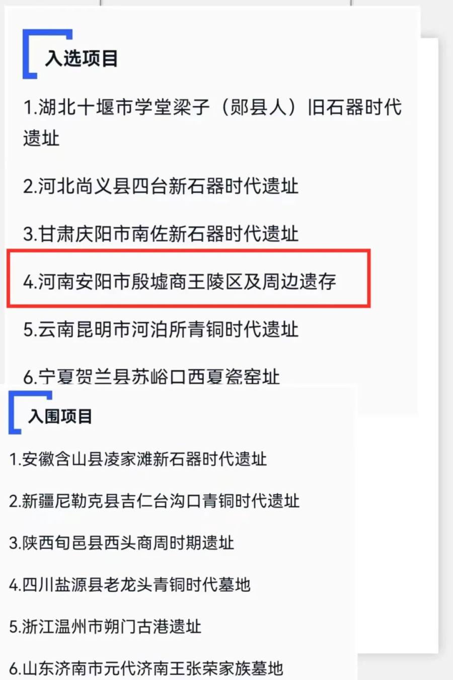 2月22日,中国社会科学院考古学论坛·2022年中国考古新发现会议在北京召开,经专家委员会评审,2022年中国考古新发现评选出6项入选项目和6项入围项目,时代跨度从旧石器时代到宋元时期。河南安阳市殷墟商王陵区及周边遗存入选考古新发现。