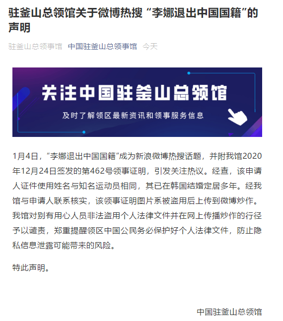 1月4日,“李娜退出中国国籍”成为新浪微博热搜话题,并附我馆2020年12月24日签发的第462号领事证明,引发关注热议。经查,该申请人证件使用姓名与知名运动员相同,其已在韩国结婚定居多年。经我馆与申请人联系核实,该领事证明图片系被盗用后上传到微博炒作。我馆对别有用心人员非法盗用个人法律文件并在网上传播炒作的行径予以谴责,郑重提醒领区中国公民务必保护好个人法律文件,防止隐私信息泄露可能带来的风险。