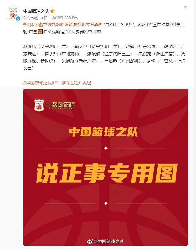 中国男篮对阵哈萨克斯坦队的12人大名单于22日晚公布,这场2023男篮世预赛F组第二轮的争夺将于2月23日晚进行。