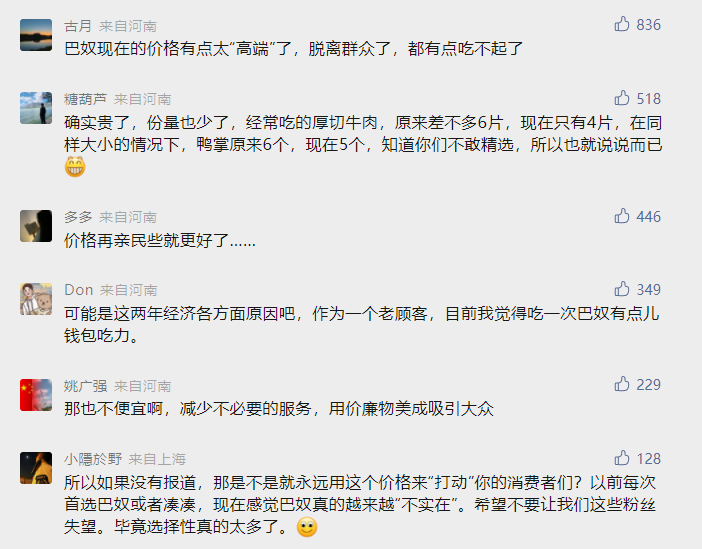 致歉声明发出后,“巴奴火锅致歉”登上全国热搜。在其官方微信公众号下,网友热评“巴奴现在价格有点太高端了,脱离群众,吃不起了”“价格再亲民些就好了”“确实贵了,分量也少了……知道你们不敢精选,也就说说而已”……值得一提的是,各类评论均公开展示在推文之下。