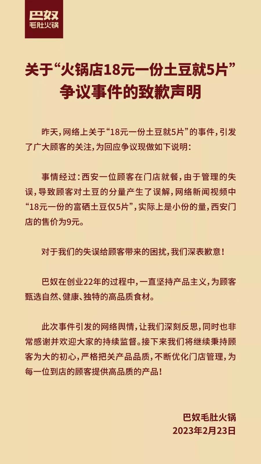 2月18日,一女子在西安赛格商场巴奴火锅店就餐时,点了一份“富硒土豆”,售价18元,待菜品端上桌后发现,整份菜只有5片土豆。随后,相关视频被公开发在了社交平台上,多番转发后引起舆论。2月23日,巴奴就此事发布了致歉声明,称所上菜品为小份的量,在西安门店的售价为9元,并对顾客造成的困扰表达了歉意。