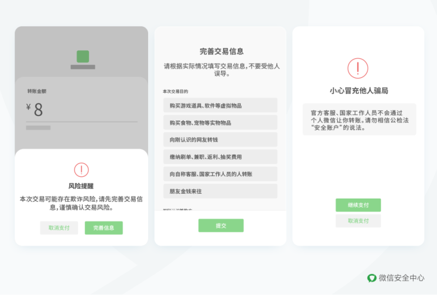 网络诈骗令人深恶痛绝,为解决这一互联网顽疾,微信构建了有效识别恶意账号和交易的安全风控系统,对有可能发生风险的场景,系统会提前对用户进行安全提示。