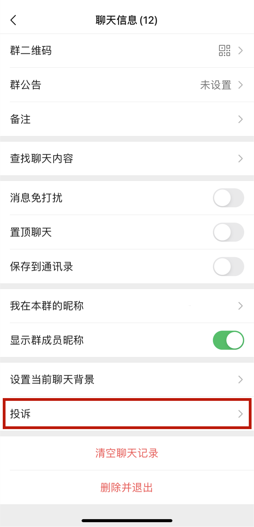 2.投诉微信群:微信群聊窗口➛右上角…➛投诉➛选择投诉该群的原因➛提交投诉证据