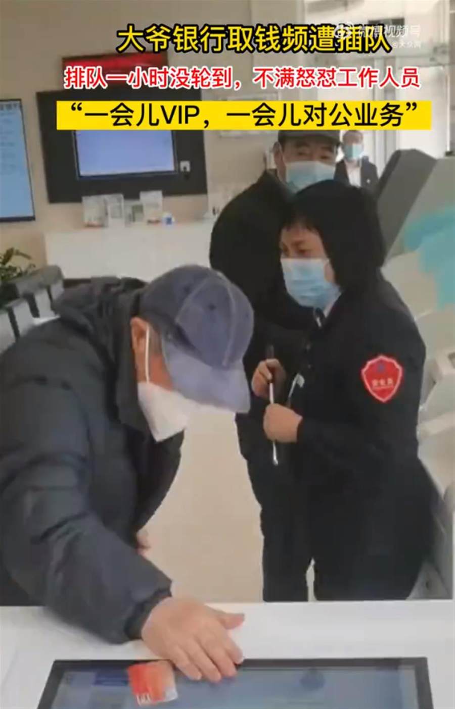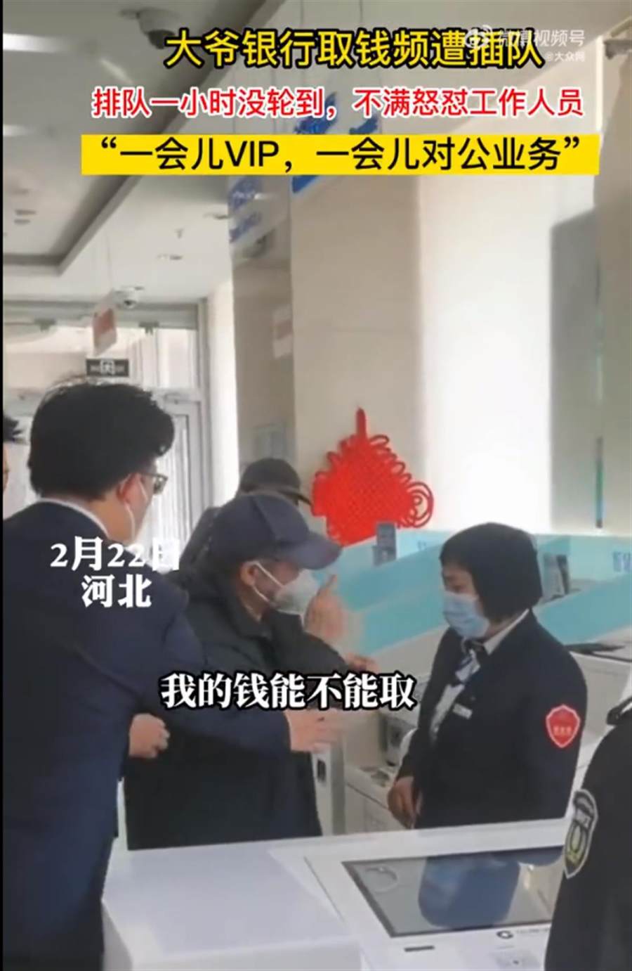 近日,河北一位老大爷在银行办业务时频遭插队,排队一小时没排上,摔卡怒斥工作人员,引发关注。大爷对着工作人员表示,“我的钱能不能取?”随后把卡摔在了机器上。拍摄者称,原因是一会一个VIP,一会一个公对公。让大爷排队等了一个小时。(据2月25日红星新闻)