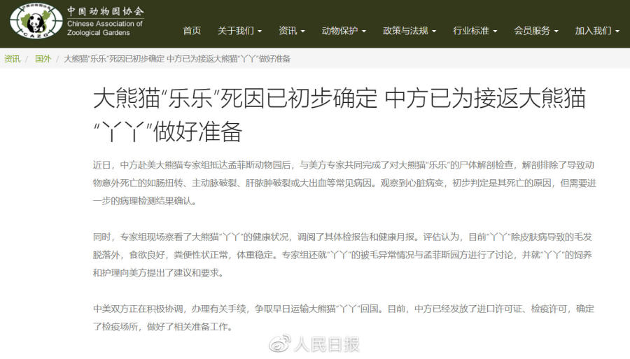 熊猫乐乐死因初步确定,中方已为接返熊猫丫丫做好准备