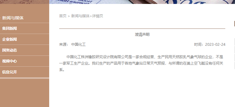 2月24日,中国化工集团有限公司发布澄清声明:中国化工株洲橡胶研究设计院有限公司是一家合规经营、生产民用天然胶乳气象气球的企业,不是一家军工生产企业。我们生产的产品用于各地气象站日常天气预报,与所谓的在美上空飞艇没有任何关系。