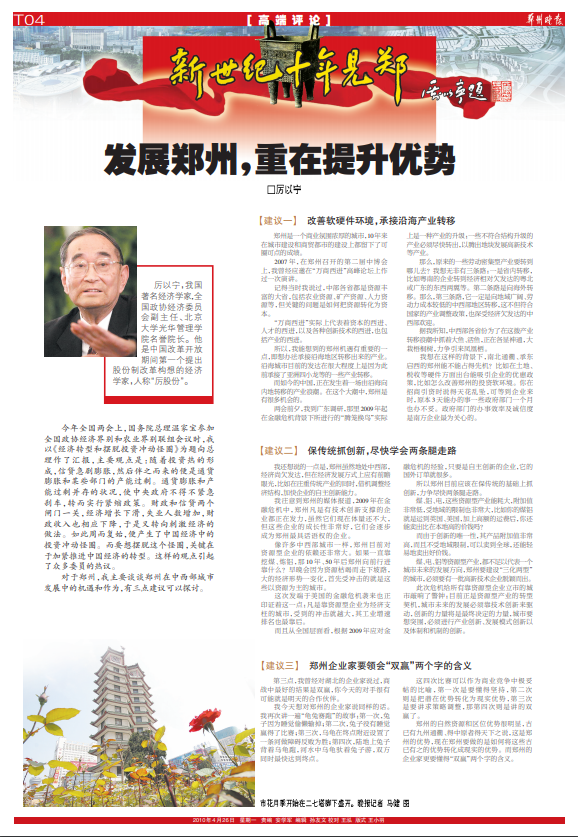 13年前的2010年,厉以宁教授在得知郑州晚报将推出大型系列政经特刊《新世纪十年见郑》时,特意题写刊名,并亲自撰写数千字的特刊开篇巨作《发展郑州,重在提升优势》,原文刊载于2010年4月26日的郑州晚报特刊中: