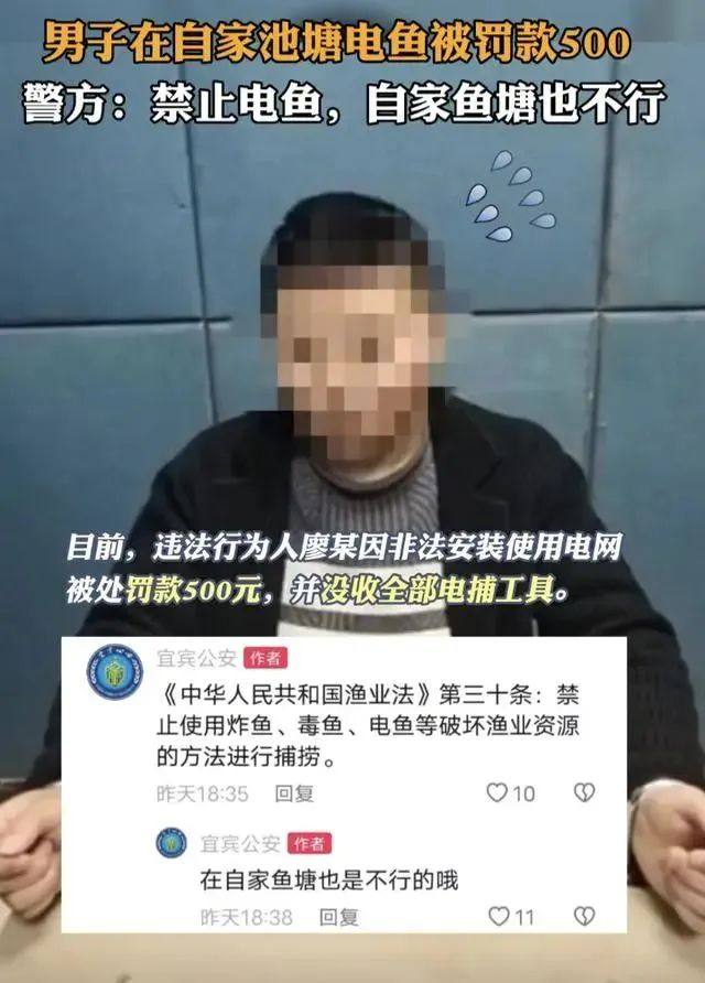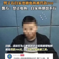 近日,四川宜宾一男子在自家鱼塘电鱼,并拍摄视频发布网络,被网友举报。随后警方传唤该男子,对其进行批评教育,并处以500元罚款。对此,不少网友表示不理解,自家鱼塘抓鱼发视频为何被罚,“自家鱼塘,自己处理,好像没有什么问题”。