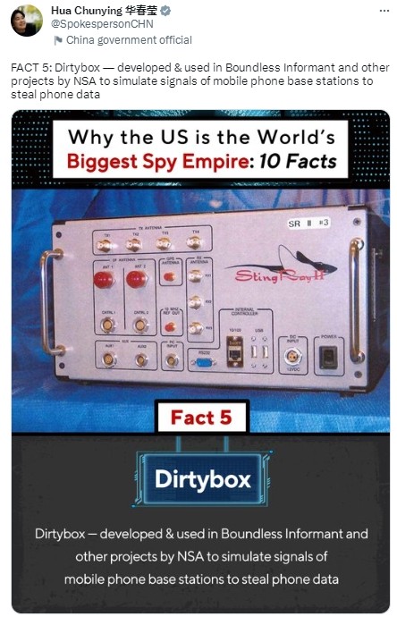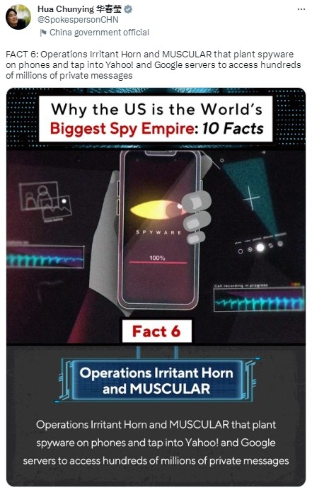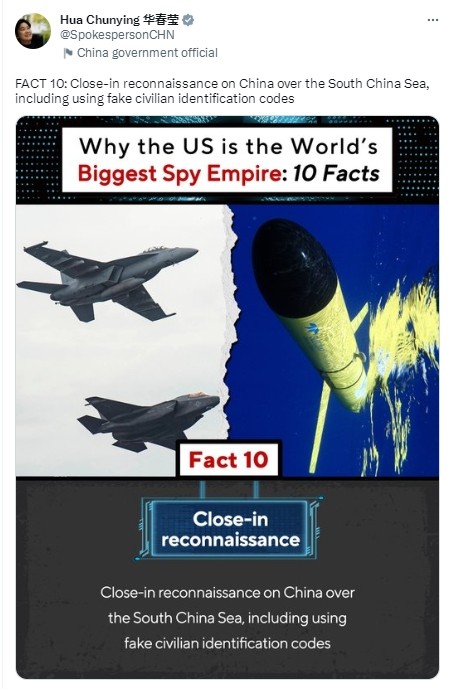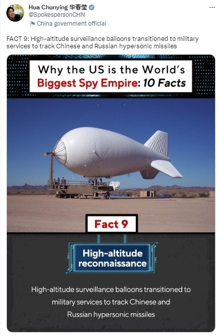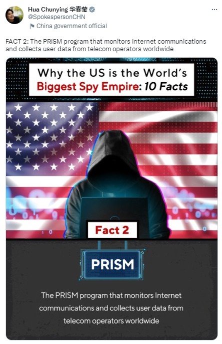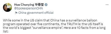 华春莹在推特上称,虽然美国部分人声称中国有一个覆盖全球五大洲的“监视气球”计划,但真相是:美国自己才是世界上最大的“监控帝国”。她晒图列举了10个有关美国是“监控帝国”的事实真相。