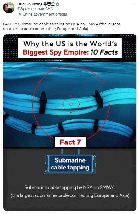 真相7:海底电缆窃密。美国国安局侵入SMW4(连接欧洲和亚洲的最大海底电缆)以窃取机密信息。