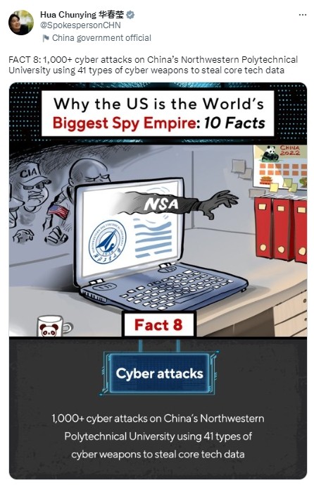 2022年6月,中国西北工业大学发布声明称该校受到境外网络攻击。同年9月,国家计算机病毒应急处理中心和360公司发布调查报告表示,西工大遭受的网络攻击武器主要分为四大类:1、漏洞攻击突破类武器;2、持久化控制类武器;3、嗅探窃密类武器;4、隐蔽消痕类武器。该报告还称,NSA掩盖真实IP精心伪装网络攻击痕迹,服务器等分布17国。