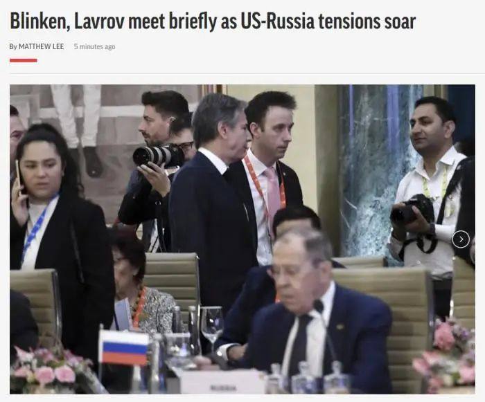 据美联社报道,当地时间2日,美国国务卿布林肯和俄罗斯外交部长拉夫罗夫在G20外长会议期间进行了简短会晤。这是数月来俄美两国首次高级别会晤。