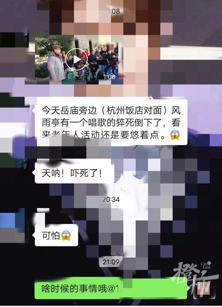 “业主发了个视频,业主在群里说,事发是在今天下午,视频里有个唱歌的大伯摔倒在风雨亭旁边。”