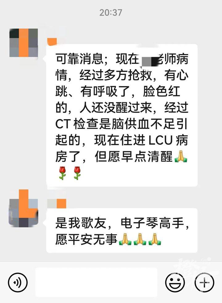 “晚上我看到有个帖子里说,摔倒的老人是电子琴高手,后来经多方抢救,有心跳呼吸了,不过人还没有醒过来。”