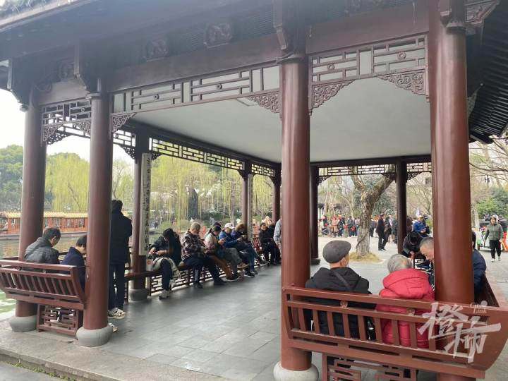 1日下午,风雨亭聚集的人还是很多,尤其老年人,坐在亭中,手握茶杯,或低头看手机,或看着远处湖面、游船。虽然很多人并不认识昨天的老人,但大家对这首《三峡情》记忆尤深。
