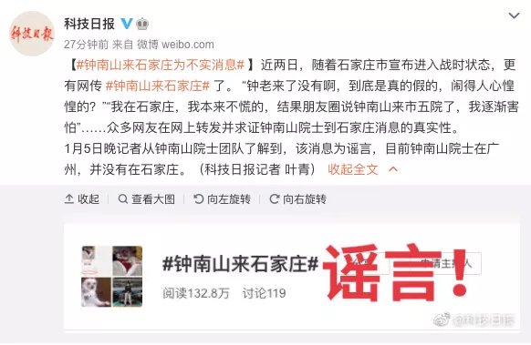 近两日,随着石家庄市宣布进入战时状态,更有网传钟南山来石家庄了。“钟老来了没有啊,到底是真的假的,闹得人心惶惶的?”“我在石家庄,我本来不慌的,结果朋友圈说钟南山来市五院了,我逐渐害怕”……众多网友在网上转发并求证钟南山院士到石家庄消息的真实性。