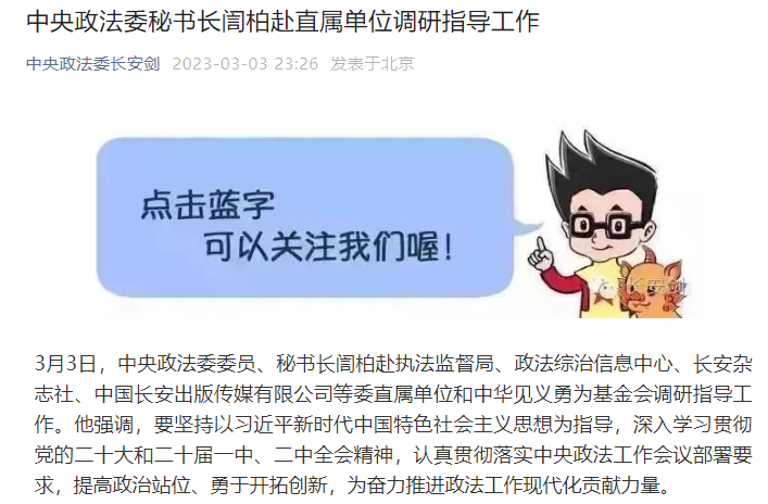 “中央政法委长安剑”微信公众号消息,3月3日,中央政法委委员、秘书长訚柏赴执法监督局、政法综治信息中心、长安杂志社、中国长安出版传媒有限公司等委直属单位和中华见义勇为基金会调研指导工作。