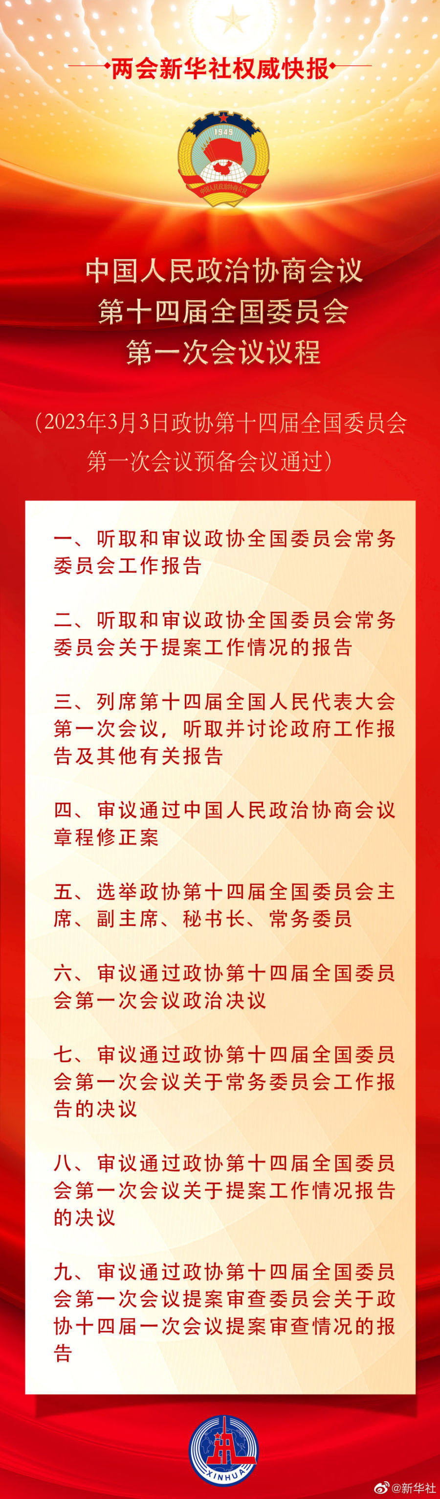 全国政协十四届一次会议今日下午3时开幕