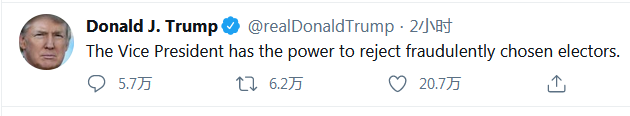 美国总统特朗普当地时间1月5日发推文称,副总统迈克·彭斯(Mike Pence)“有权拒绝通过欺诈手段选中的选举人”。