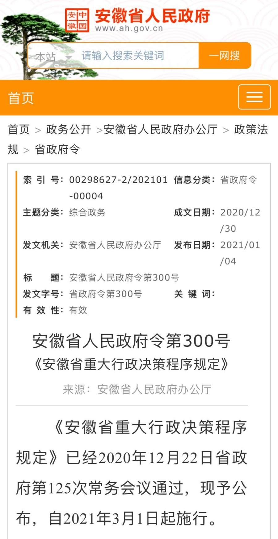 安徽省政府日前发布第300号政府令——《安徽省重大行政决策程序规定》,将自2021年3月1日起施行。根据规定,政府重大行政决策须经公众参与、专家论证、风险评估、公平竞争审查、合法性审查、集体讨论决定等多个环节。决策机关违反本规定造成决策严重失误,或依法应当及时作出决策而久拖不决,造成重大损失、恶劣影响的,应当倒查责任,实行终身责任追究,对决策机关行政首长、负有责任的其他领导人员和直接责任人员依法追究责任。