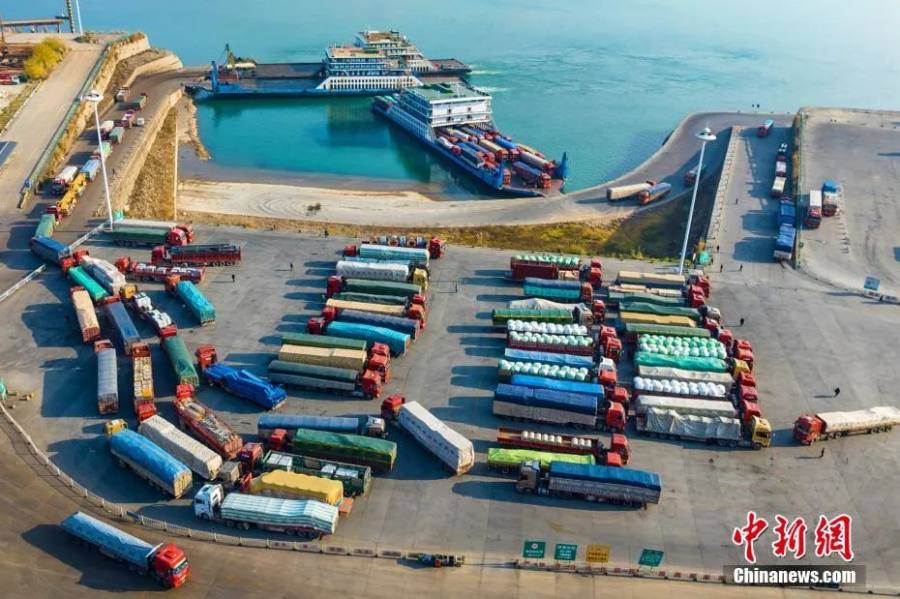 资料图:长江三峡西陵峡段,江面船只往来穿梭,滚装码头全天候作业。图为繁忙的秭归滚装码头。