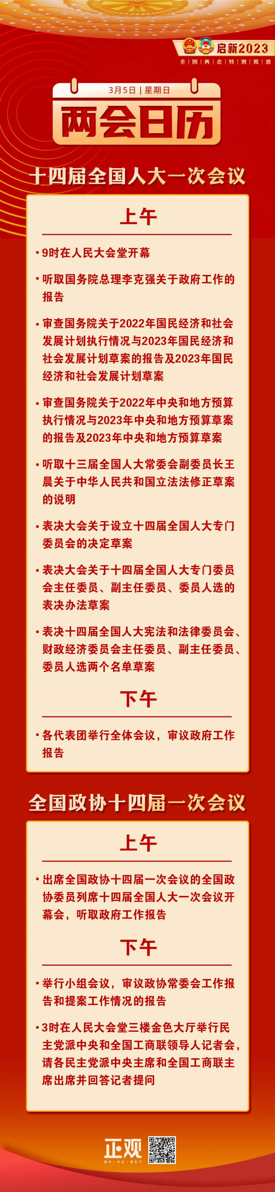 新华社北京3月4日电 十四届全国人大一次会议5日上午9时在人民大会堂开幕,听取国务院总理李克强关于政府工作的报告,审查国务院关于2022年国民经济和社会发展计划执行情况与2023年国民经济和社会发展计划草案的报告及2023年国民经济和社会发展计划草案,审查国务院关于2022年中央和地方预算执行情况与2023年中央和地方预算草案的报告及2023年中央和地方预算草案,听取十三届全国人大常委会副委员长王晨关于中华人民共和国立法法修正草案的说明,表决大会关于设立十四届全国人大专门委员会的决定草案,表决大会关于十四届全国人大专门委员会主任委员、副主任委员、委员人选的表决办法草案,表决十四届全国人大宪法和法律委员会、财政经济委员会主任委员、副主任委员、委员人选两个名单草案。下午,各代表团举行全体会议,审议政府工作报告。