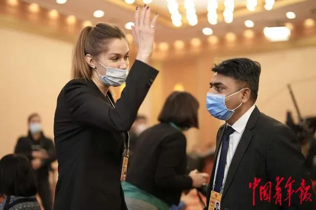 3月7日上午,北京梅地亚中心,十四届全国人大一次会议记者会前,两名外媒记者在交流。 图源 中国青年报