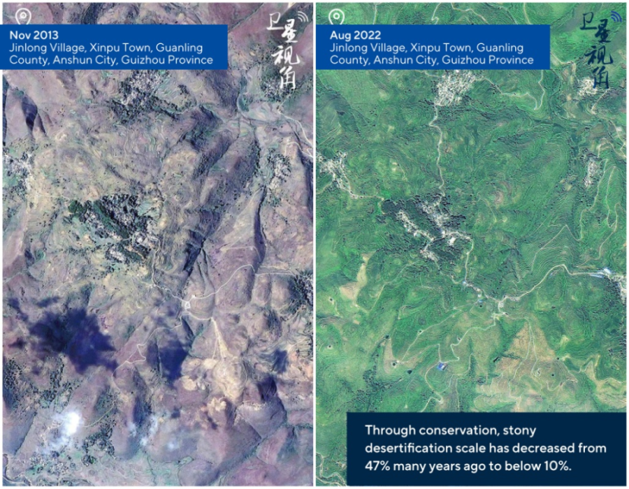 “卫星视角看过去10年来(中国)在高质量发展、生态保护、交通建设、对外开放、扶贫攻坚(领域)的变化,”华春莹在第一组对比图上方配文写道。第一组卫星对比图显示了2013年11月、2022年8月贵州省安顺市关岭自治县新铺镇金龙村的样貌,通过生态保护,该地区石漠化程度由此前的47%下降到10%以下。↓
