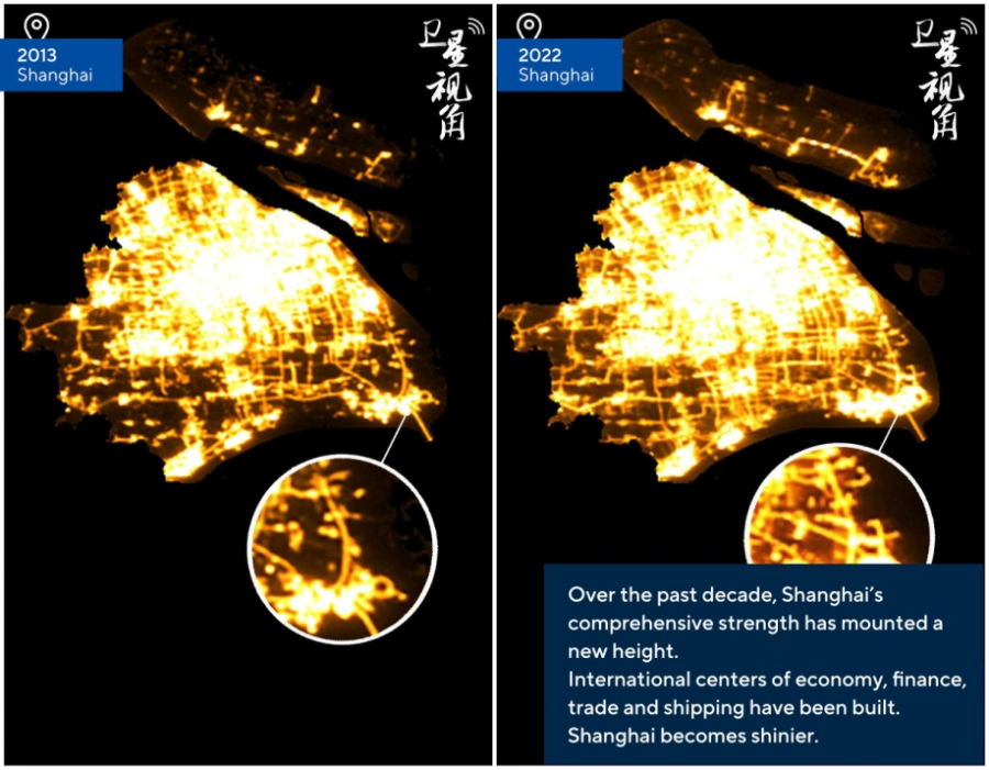 第三组卫星对比图显示了2013年、2022年上海市的夜景样貌,过去10年间,上海综合实力迈上新台阶,国际经济、金融、贸易、航运中心相继建成,上海夜晚变得更加闪亮。↓