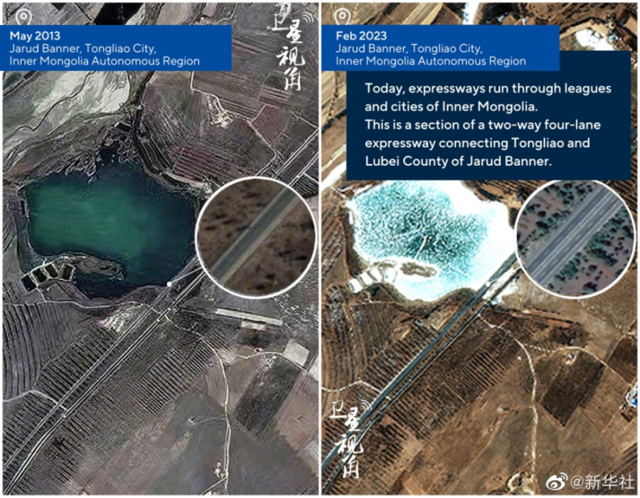 第四组卫星对比图显示了2013年5月、2023年2月内蒙古通辽市扎鲁特旗的样貌,如今,高速公路已贯穿内蒙古各盟市,右边卫星图则展现了连接通辽市和扎鲁特旗鲁北镇的双向四车道高速公路的一段。↓