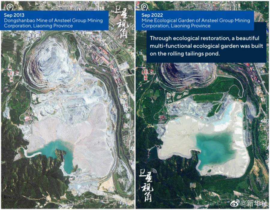 第五组卫星对比图显示了2013年9月辽宁省鞍钢集团矿业有限公司大孤山铁矿东山包尾矿、2022年9月辽宁省鞍钢集团矿业有限公司的矿山生态园,通过生态修复,当地把尾矿改建成一个风光绮丽的多功能生态园。↓