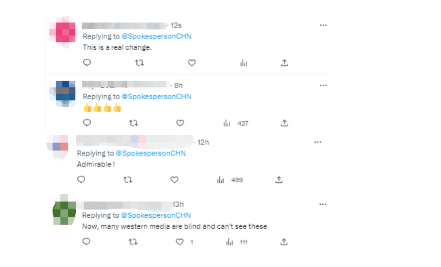 在华春莹上述推文后,有不少网友留言表示为这些改变而深有感触,“这是真正的变化。”“很令人钦佩。”也有网友感叹,“(但)许多西方媒体这时是眼盲的,看不到这些(变化)。”↓