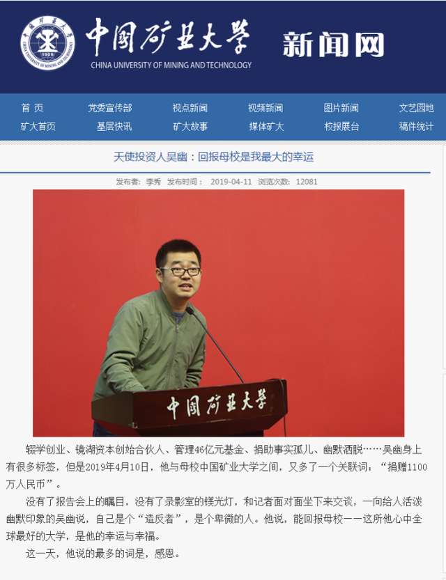 需要指出的是,吴幽当初通过这一事件获得了实实在在的回报,校方为其颁发了“中国矿业大学特别校务参事”和“中国矿业大学创新创业导师”聘书,媒体对此事的广泛报道,也让吴幽博得了美誉。然而,吴幽最终分文未给,显然令校方无法接受。