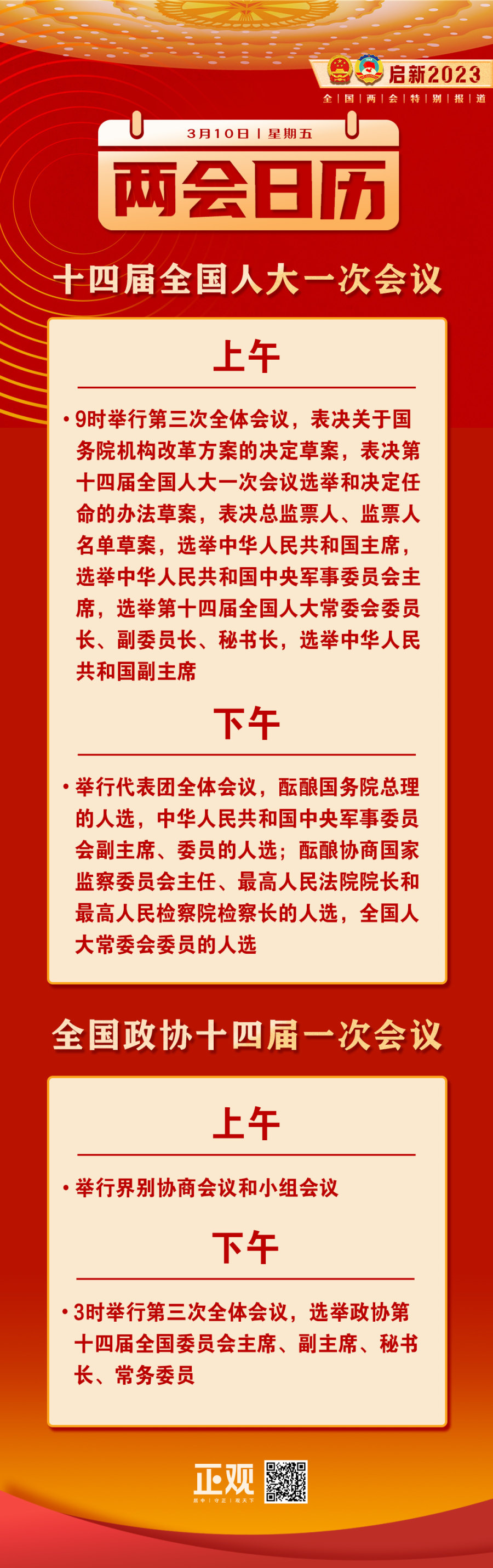 新华社北京3月9日电 10日上午9时,十四届全国人大一次会议在人民大会堂举行第三次全体会议,表决关于国务院机构改革方案的决定草案,表决第十四届全国人大一次会议选举和决定任命的办法草案,表决总监票人、监票人名单草案,选举中华人民共和国主席,选举中华人民共和国中央军事委员会主席,选举第十四届全国人大常委会委员长、副委员长、秘书长,选举中华人民共和国副主席。