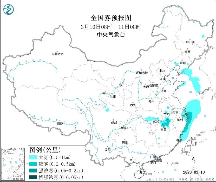 预计,3月10日白天至夜间,黄海东部海域、东海西部海域、辽东半岛东部沿岸海域、山东半岛东部沿岸海域、长江口附近海域、杭州湾附近海域、浙江沿岸海域、福建北部沿岸海域将有能见度不足1公里的大雾,部分海域有能见度不足500米的浓雾。另外,10日早晨至上午,湖北东部、江西北部等地的部分地区有大雾天气,局地有能见度不足200米的强浓雾。