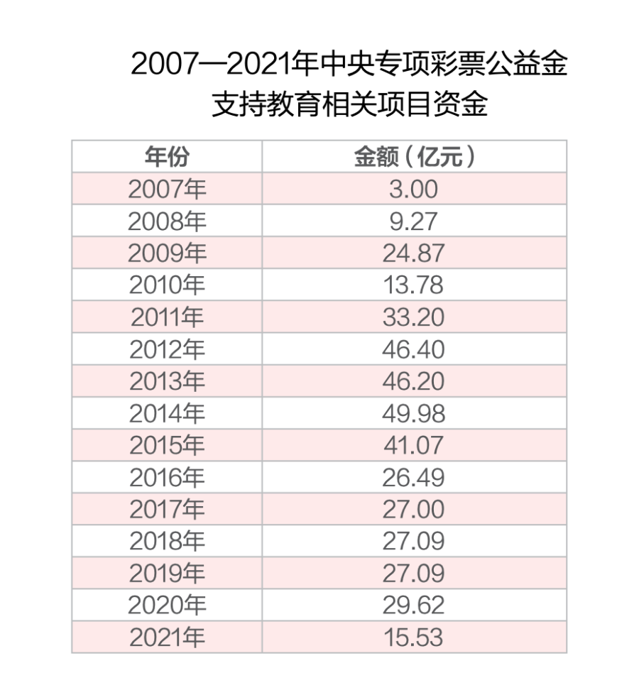 据本刊统计,2007年至今,用于支持我国教育事业的中央专项彩票公益金达400多亿元。仅在2021年,财政部就投入15.53亿元中央专项彩票公益金支持教育事业,占全年中央专项彩票公益金的11%。