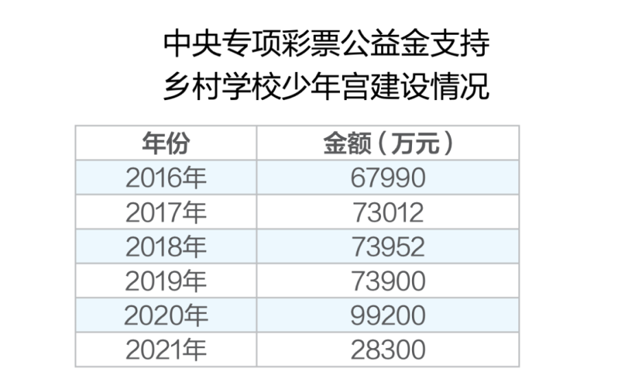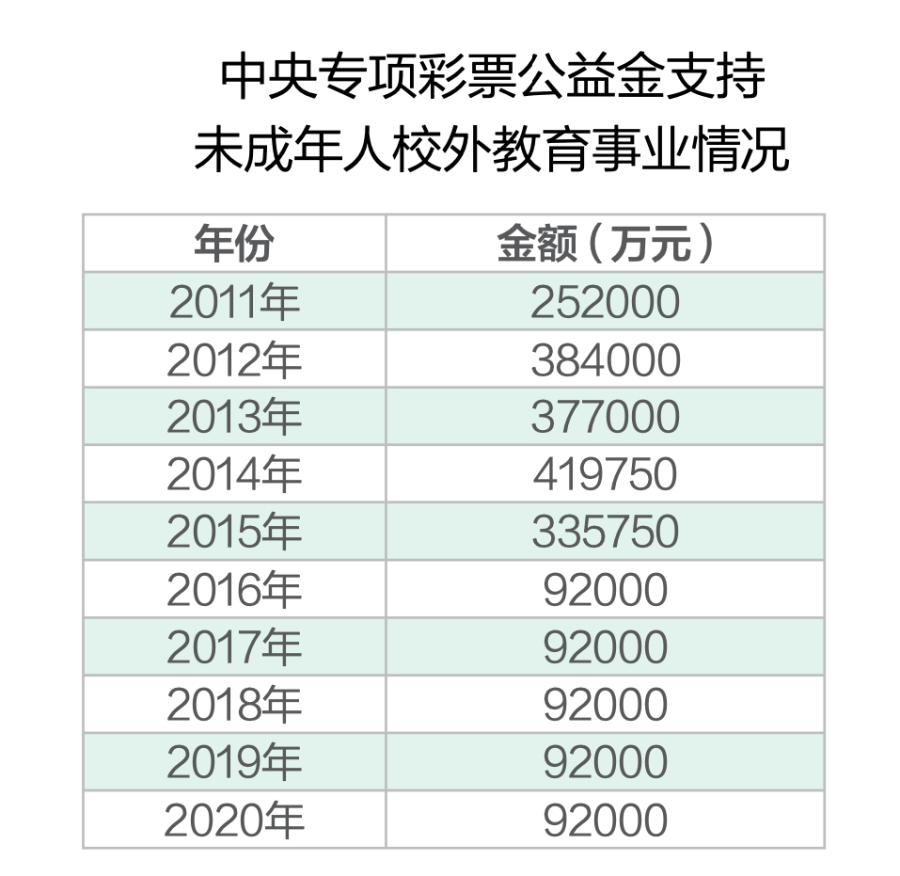 2011年,财政部发布的《中央专项彩票公益金使用情况公告》显示,新增的「未成年人校外教育事业项目」替代了原来的「青少年学生校外活动场所建设项目」。该项目由中央文明办、教育部等部门组织实施,主要用于校外教育活动保障、未成年人校外活动场所能力提升和乡村学校少年宫建设项目。