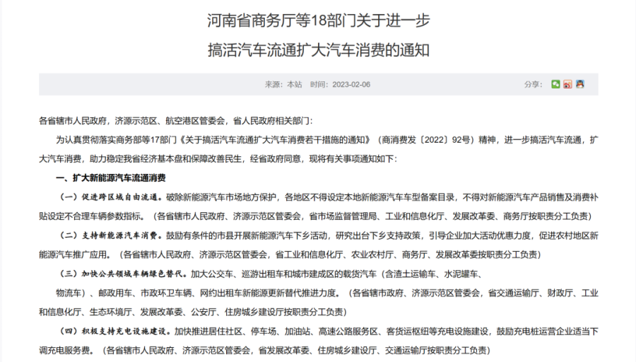 部委发力之际,地方政府也在加快政策的部署落实。2月6日,河南省商务厅等18部门联合发布《关于进一步搞活汽车流通扩大汽车消费的通知》,从扩大新能源汽车流通消费、繁荣二手车市场、促进汽车更新消费、加快发展汽车平行进口、改善和提升汽车使用环境、丰富汽车金融服务六方面提出多项具体政策措施。