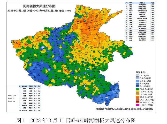 大风:受冷空气影响,3月11日6-16 时,我省北部、中东部和西部部分县市出现 6 到 7 级大风,安阳、濮阳、鹤壁、新乡、三门峡、郑州、开封、许昌等 78 个县(市、区)共 409 站达 8 级以上,风速前三站分别为:禹州市无梁 29.1 米/秒(11 级)、淇县裕丰 28.5 米/秒(11 级)、卫辉市香泉 28.3 米/秒(10 级)。郑州东部出现 6 级以上大风,阵风 7 到 8 级,最大风速中牟县姚家 20.7 米/秒(8 级)。