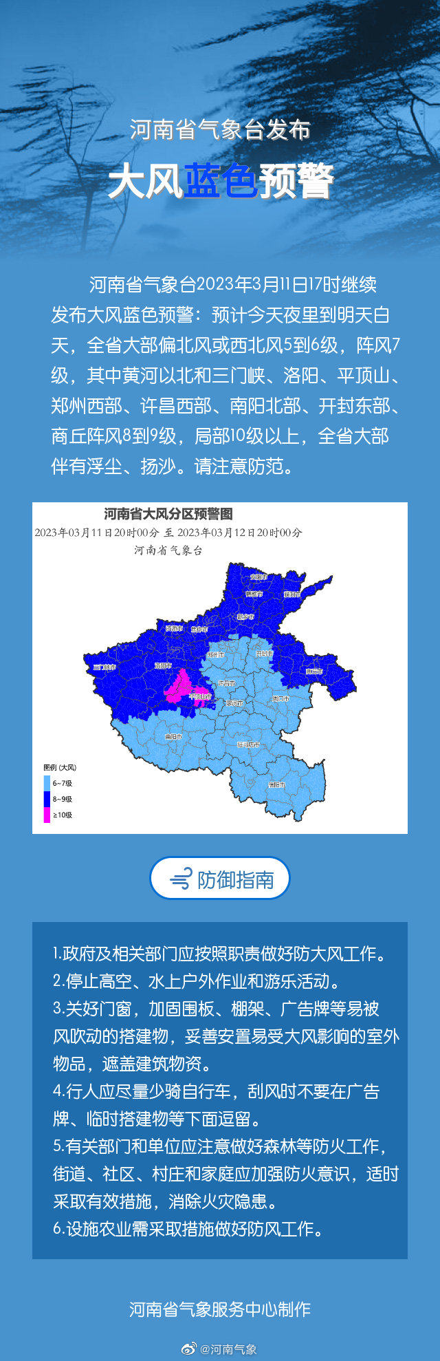 河南省气象台2023年3月11日17时继续发布大风蓝色预警: