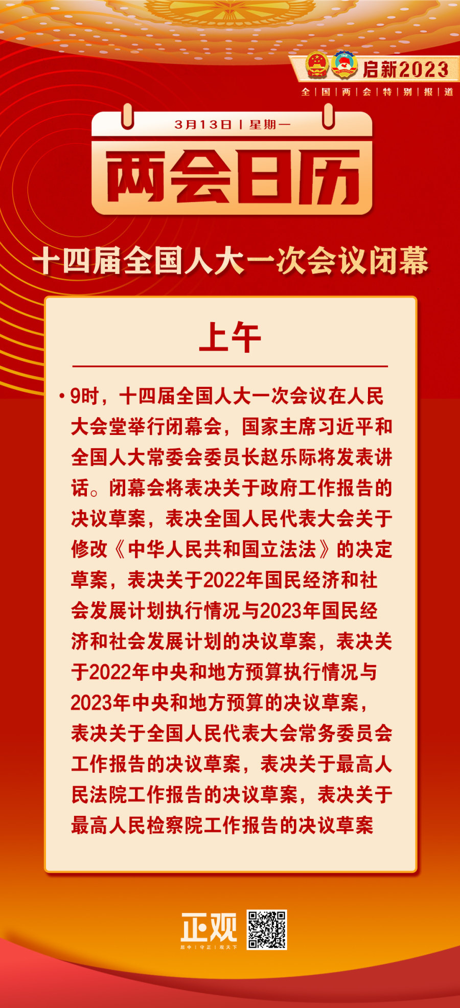 新华社北京3月12日电 13日上午9时,十四届全国人大一次会议在人民大会堂举行闭幕会,国家主席习近平和全国人大常委会委员长赵乐际将发表讲话。闭幕会将表决关于政府工作报告的决议草案,表决全国人民代表大会关于修改《中华人民共和国立法法》的决定草案,表决关于2022年国民经济和社会发展计划执行情况与2023年国民经济和社会发展计划的决议草案,表决关于2022年中央和地方预算执行情况与2023年中央和地方预算的决议草案,表决关于全国人民代表大会常务委员会工作报告的决议草案,表决关于最高人民法院工作报告的决议草案,表决关于最高人民检察院工作报告的决议草案。
